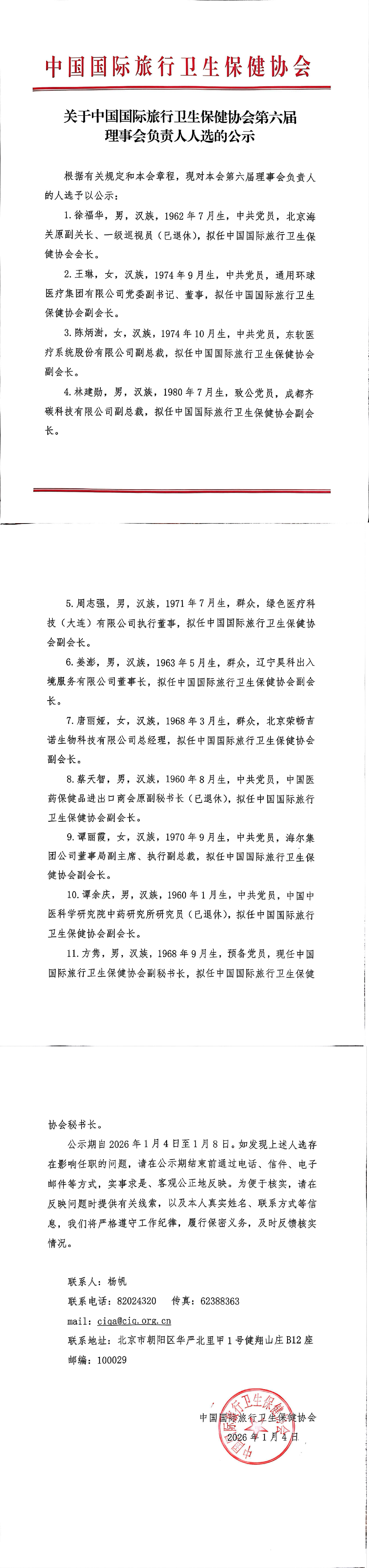 关于中国国际旅行卫生保健协会第六届理事会负责人人选的公示